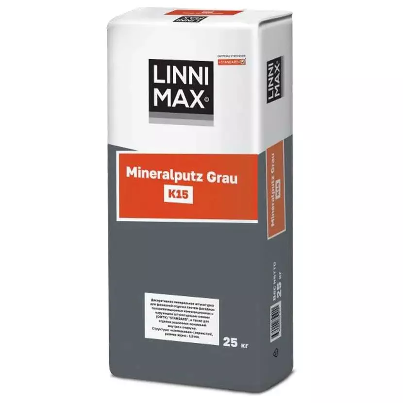 Декоративный штукатурный состав LINNIMAX Mineralputz Grau K15 (Минералпутц Грау К15) – это высококачественный материал на цементной основе, предназначенный для создания декоративно-защитного финишного слоя на различных поверхностях. Штукатурка имеет серый цвет и подходит для обработки стен, а также вертикальных и наклонных поверхностей. Благодаря своей универсальности, она идеально подходит для использования на бетонных и цементных основаниях, обеспечивая долговечность и эстетичный внешний вид.
