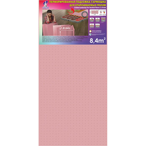 Подложка-гармошка под ламинат перфорированная для ТП Солид XPS 1,8 мм/8,4 м² розовая — это высококачественный материал, разработанный специально для укладки напольных покрытий, таких как ламинат и паркет. Она идеально подходит для использования в сочетании с системами теплого пола, обеспечивая равномерное распределение тепла и предотвращая перегрев. Перфорация на поверхности подложки способствует эффективной вентиляции, что предотвращает образование конденсата и продлевает срок службы напольного покрытия.