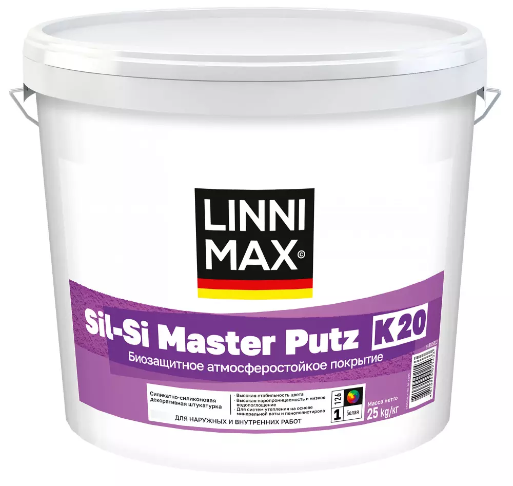 Штукатурка декоративная силикатно-силиконовая LINNIMAX Sil Si Master Putz / Сил Си Мастер Путц K20 База 1 25 кг – это высококачественный отделочный материал, предназначенный для создания долговечного и эстетичного покрытия на различных поверхностях. Основу штукатурки составляют силикон и силикат, что обеспечивает ей отличные эксплуатационные характеристики. Материал подходит как для внутренних, так и для наружных работ, что делает его универсальным решением для отделки стен, вертикальных и наклонных поверхностей. Штукатурка идеально подходит для устройства декоративно-защитного финишного слоя, придавая поверхностям привлекательный внешний вид и надежную защиту от внешних воздействий.